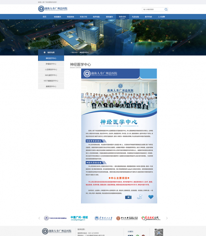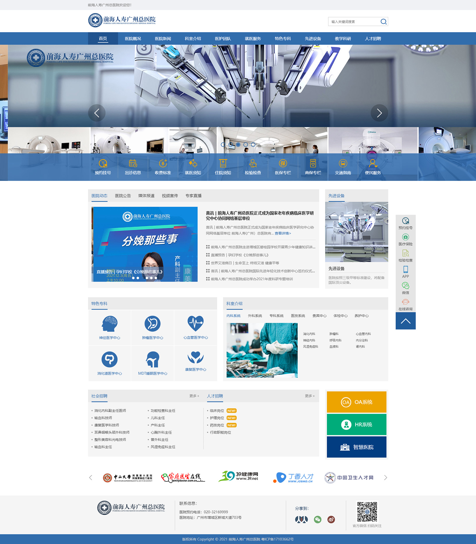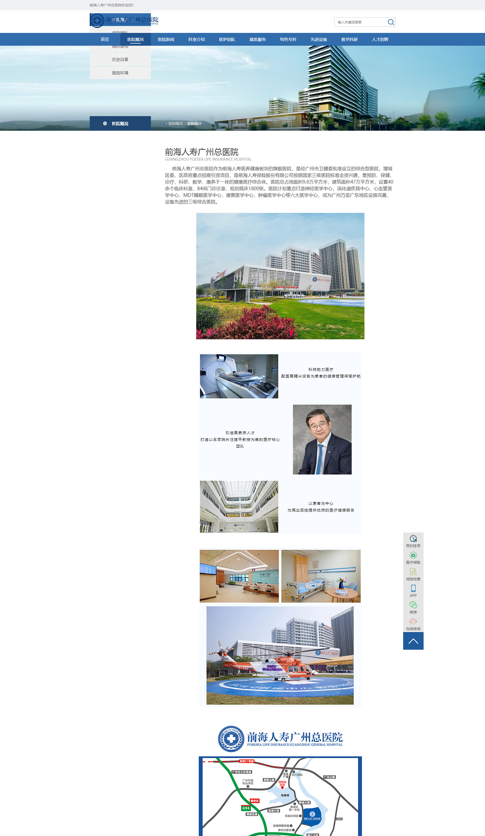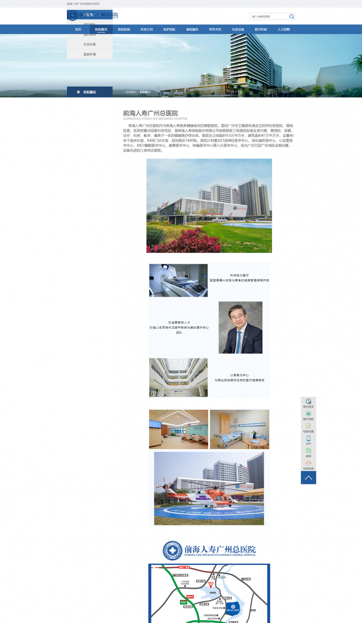 前海人壽廣州總醫院作為前海人壽醫養健康板塊的旗艦醫院,是經廣州市衛健委批準設立的綜合型醫院,增城區委、區政府重點招商引資項目,是前海人壽保險股份有限公司按照國家三級醫院標準全資興建,集預防、保健、診療、科研、教學、康養于一體的健康醫療綜合體。醫院總占地面積9.8萬平方米,建筑面積47萬平方米,設置40余個臨床科室、84間門診診室、規劃病床1800張。醫院計劃重點打造神經醫學中心、消化道疾病中心、心血管醫學中心、MDT睡眠醫學中心、康復醫學中心、腫瘤醫學中心等六大醫學中心,成為廣州乃至廣東地區設施完善、設備先進的三級綜合醫院。
