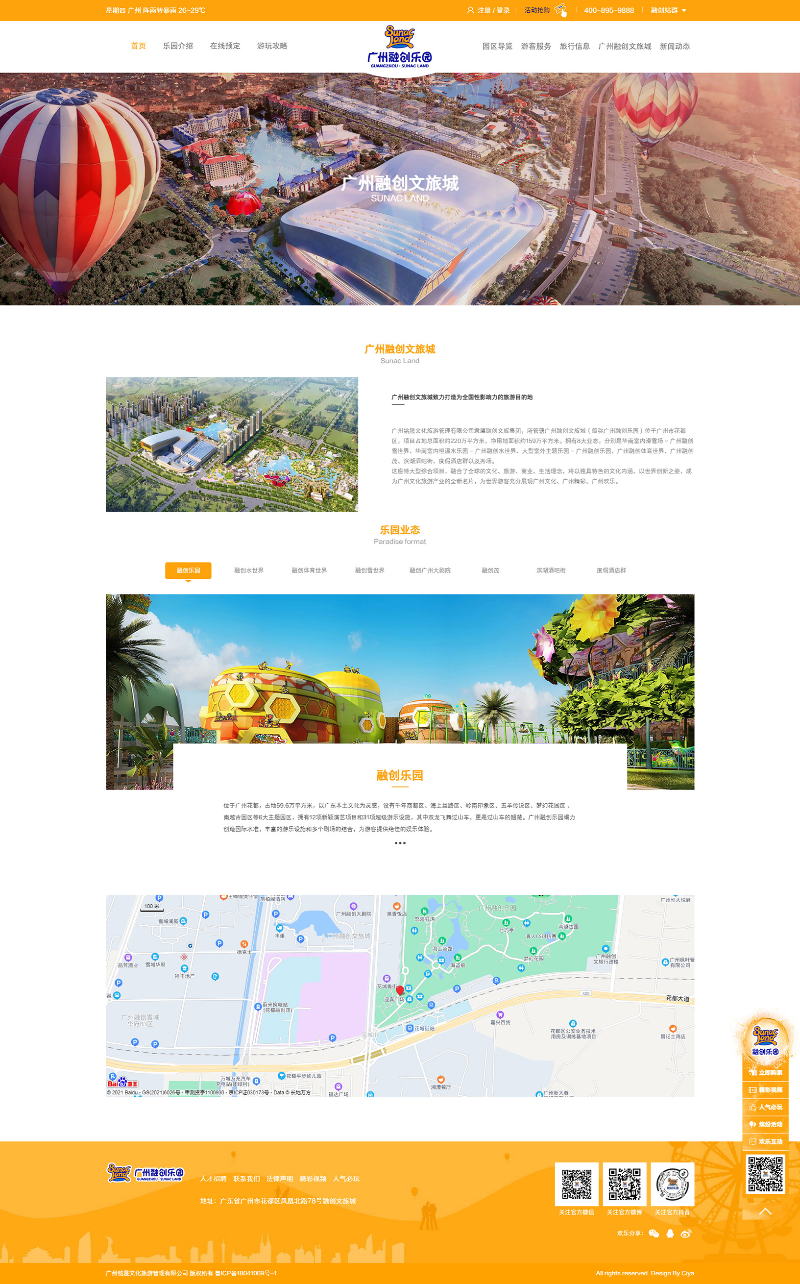 廣州銘晟文化旅游管理有限公司隸屬融創(chuàng)文旅集團(tuán),所管轄廣州融創(chuàng)文旅城(簡(jiǎn)稱廣州融創(chuàng)樂(lè)園)位于廣州市花都區(qū),項(xiàng)目占地總面積約220萬(wàn)平方米,凈用地面積約159萬(wàn)平方米。擁有8大業(yè)態(tài),分別是華南室內(nèi)滑雪場(chǎng) - 廣州融創(chuàng)雪世界、華南室內(nèi)恒溫水樂(lè)園 - 廣州融創(chuàng)水世界、大型室外主題樂(lè)園 - 廣州融創(chuàng)樂(lè)園、廣州融創(chuàng)體育世界、廣州融創(chuàng)茂、濱湖酒吧街、度假酒店群以及秀場(chǎng)。